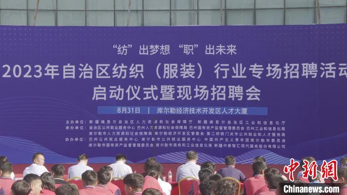 中新網新疆庫爾勒8月31日電(王小軍 劉雨珊 袁媛)8月31日,以“‘紡’出夢想 ‘職’造未來”為主題的新疆紡織(服裝)產業專場招聘活動在巴州庫爾勒市正式啟動。